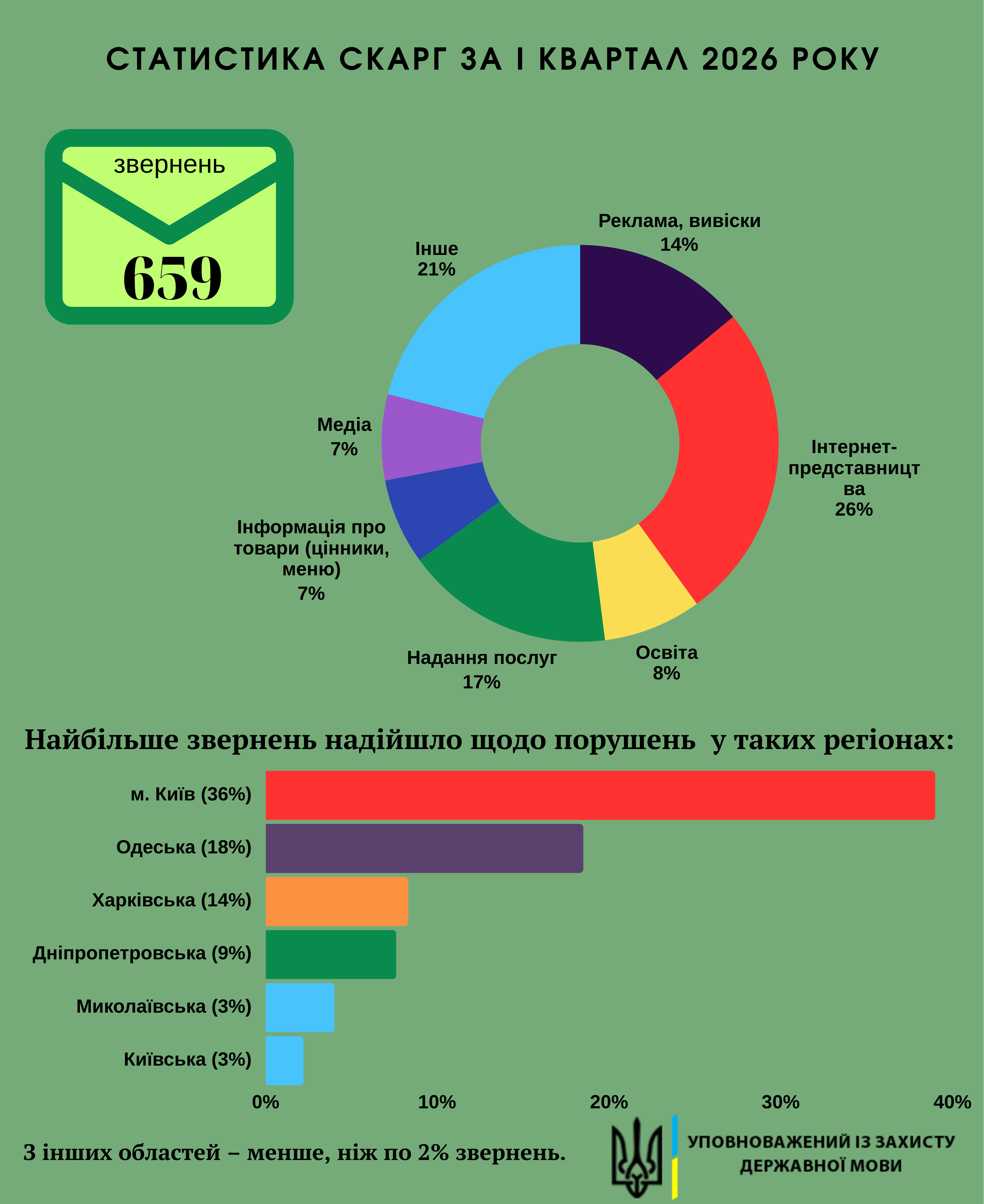 За І квартал 2026 року до Уповноваженої надійшло 659 скарг щодо порушення мовного законодавства, 36% - з Києва
