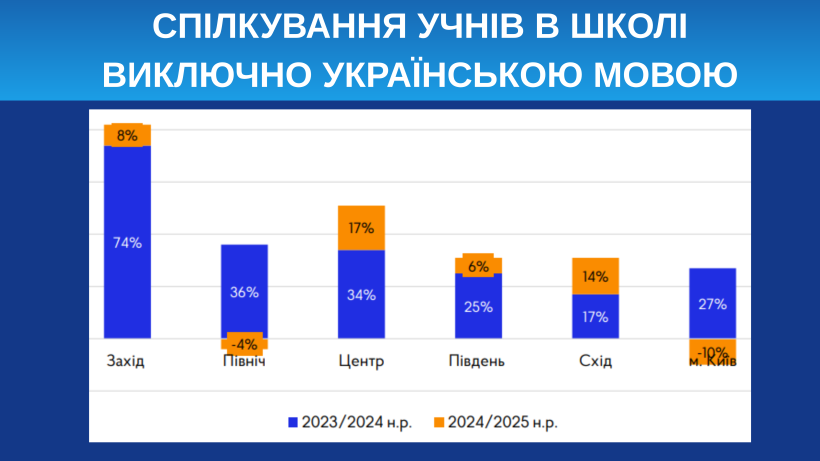 Загалом по Україні спостерігається поступове зменшення використання російської мови, однак у Північному регіоні простежується негативна динаміка. Особливо загрозлива ситуація у Києві: лише 17% учнів спілкуються в школі виключно українською, що на 10% менше, ніж торік.