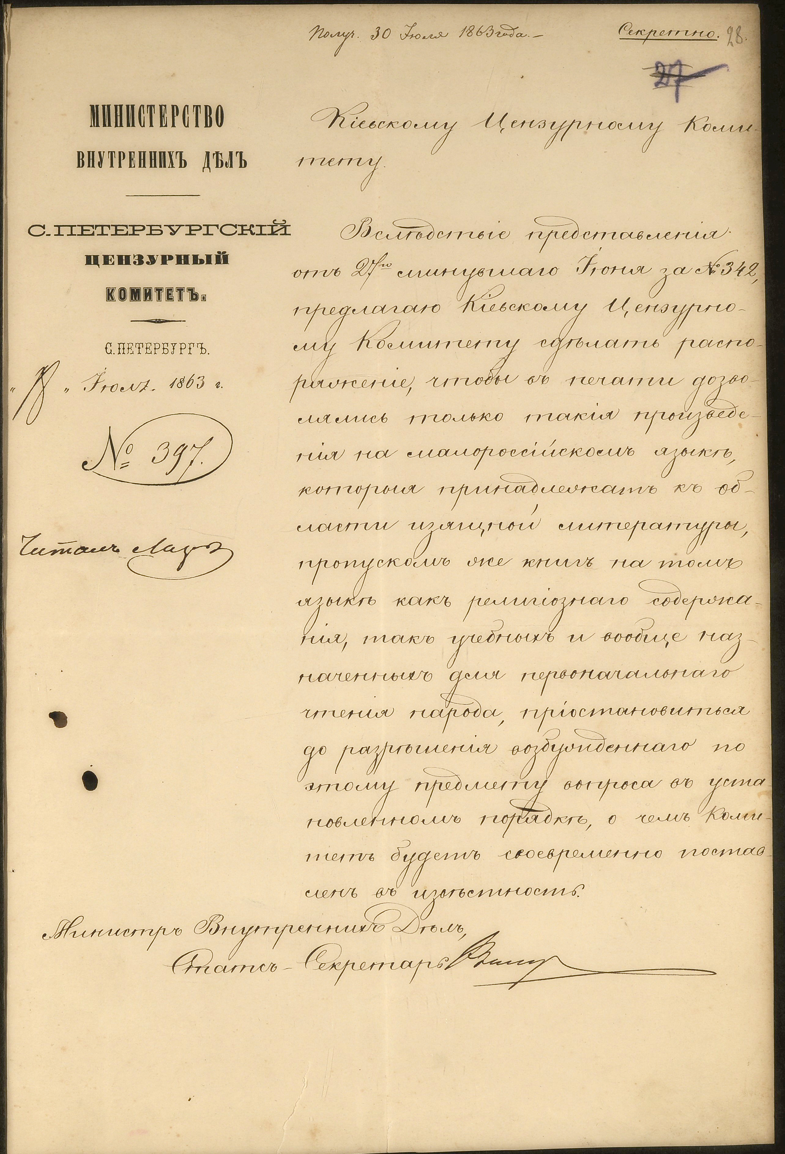 1863 р., липня 18. – Розпорядження міністра внутрішніх справ П. О. Валуєва