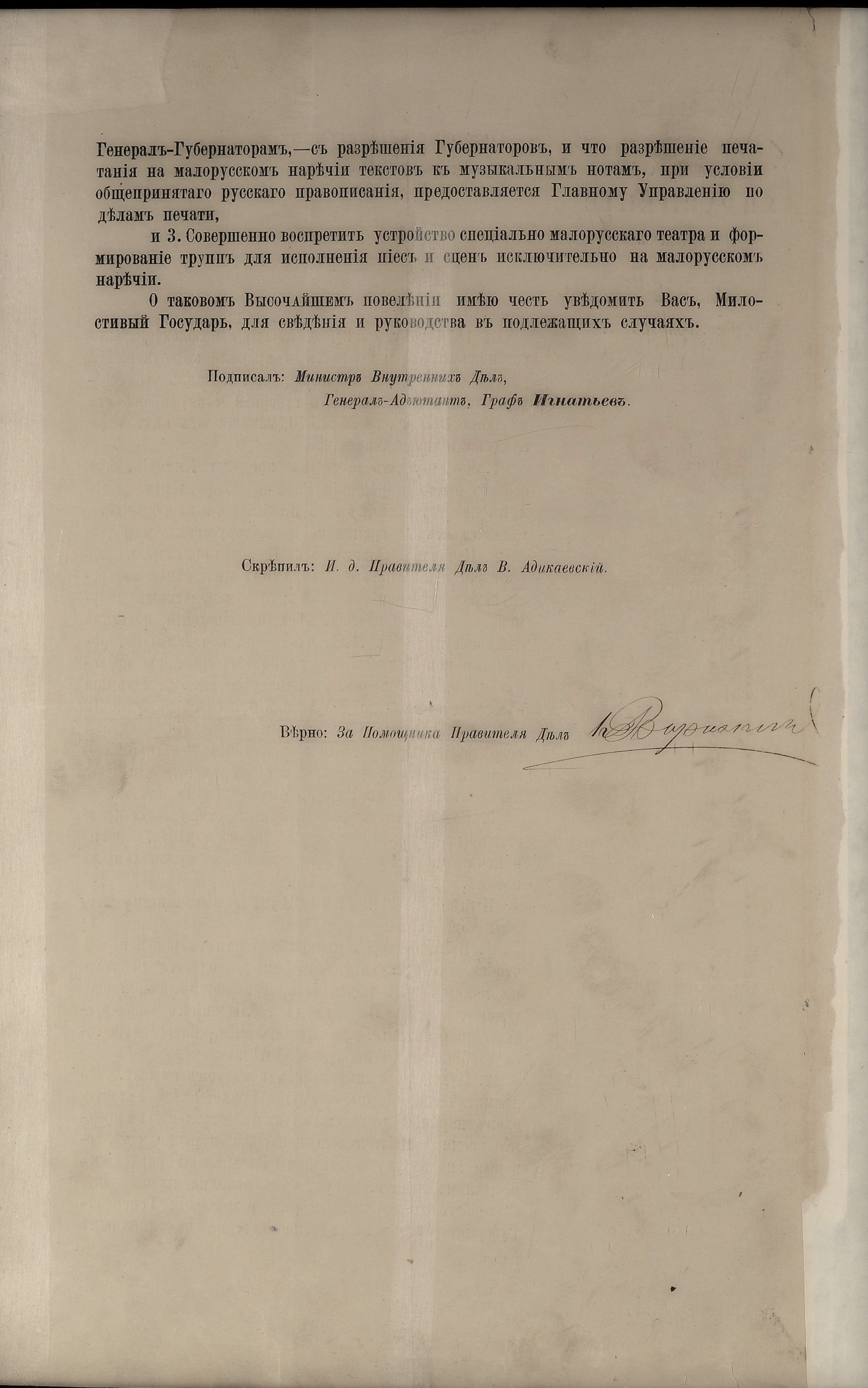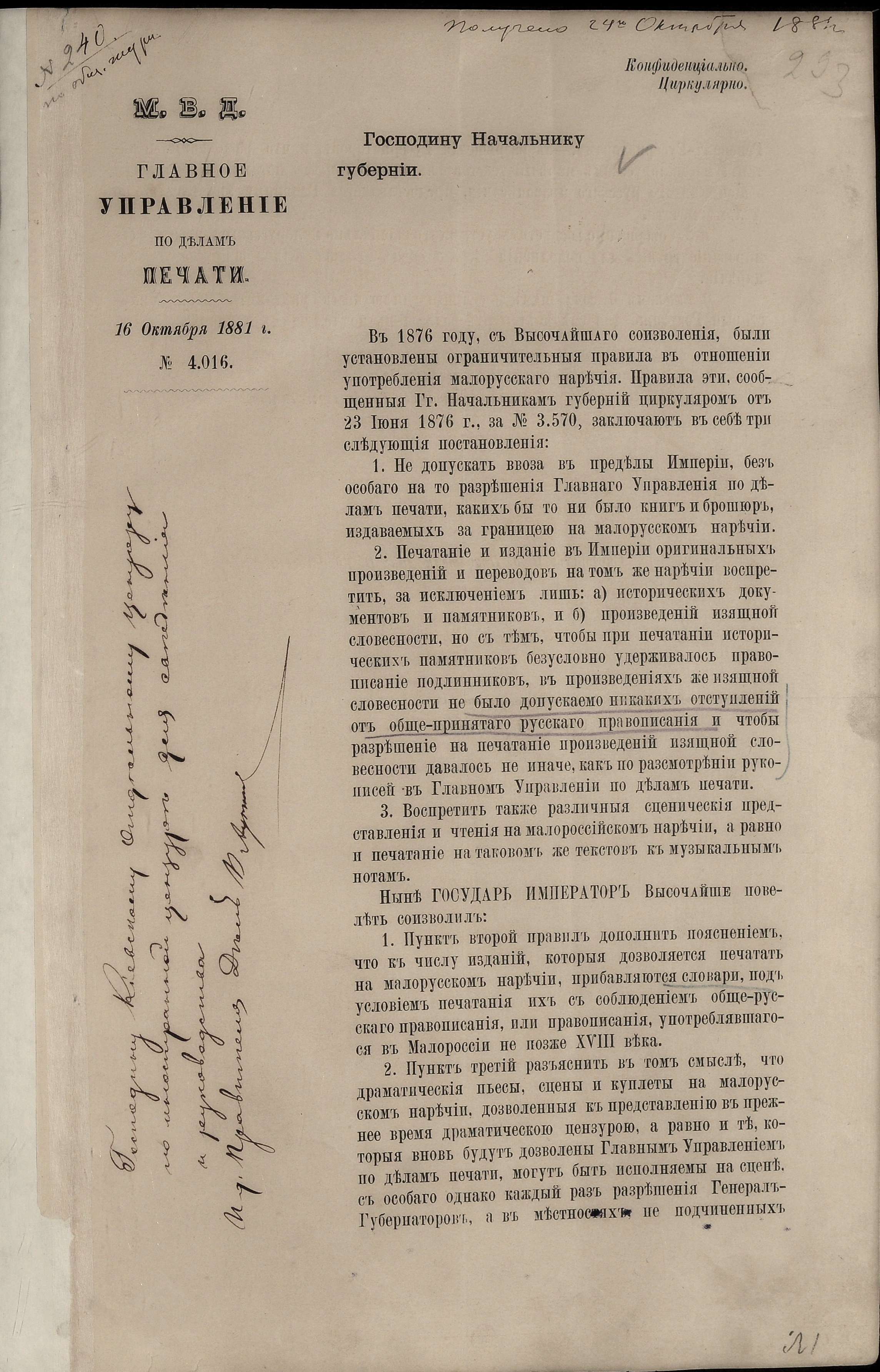 1881 р., жовтня 16. – Циркуляр міністра внутрішніх справ М. П. Ігнатьєва київському,