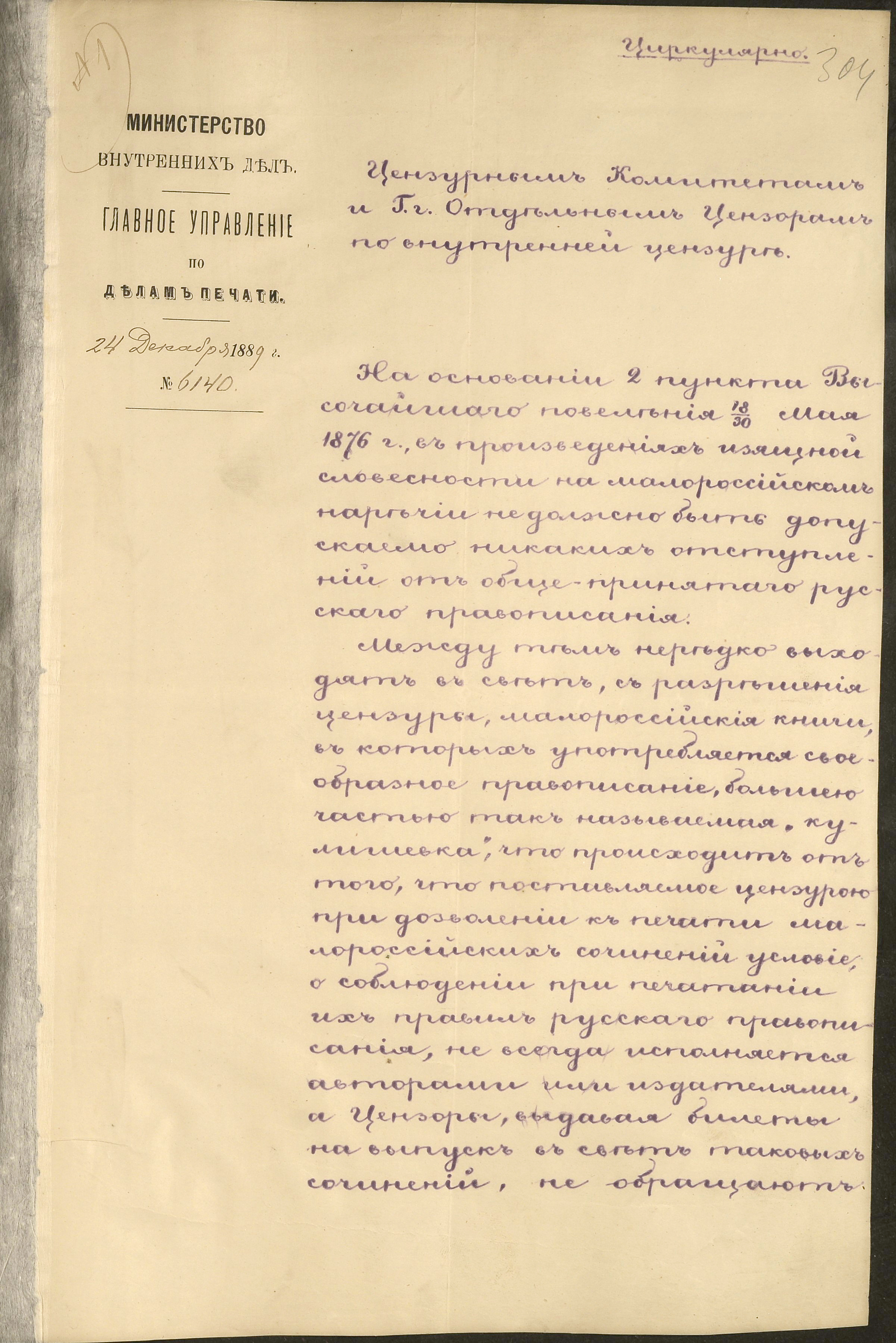 1889 р., грудня 24. – Циркуляр Головного управління у справах друку цензурним комітетам і окремим цензорам