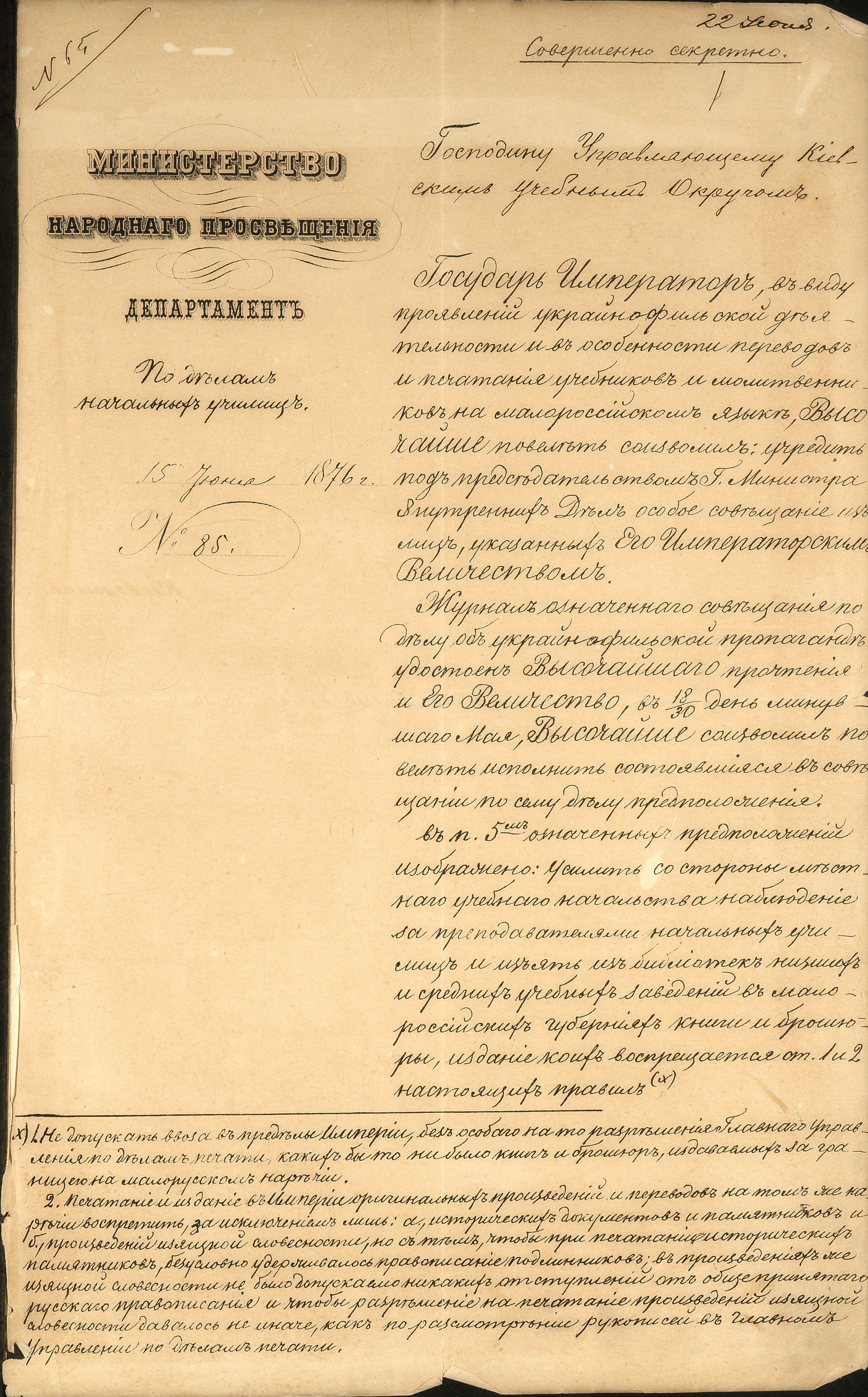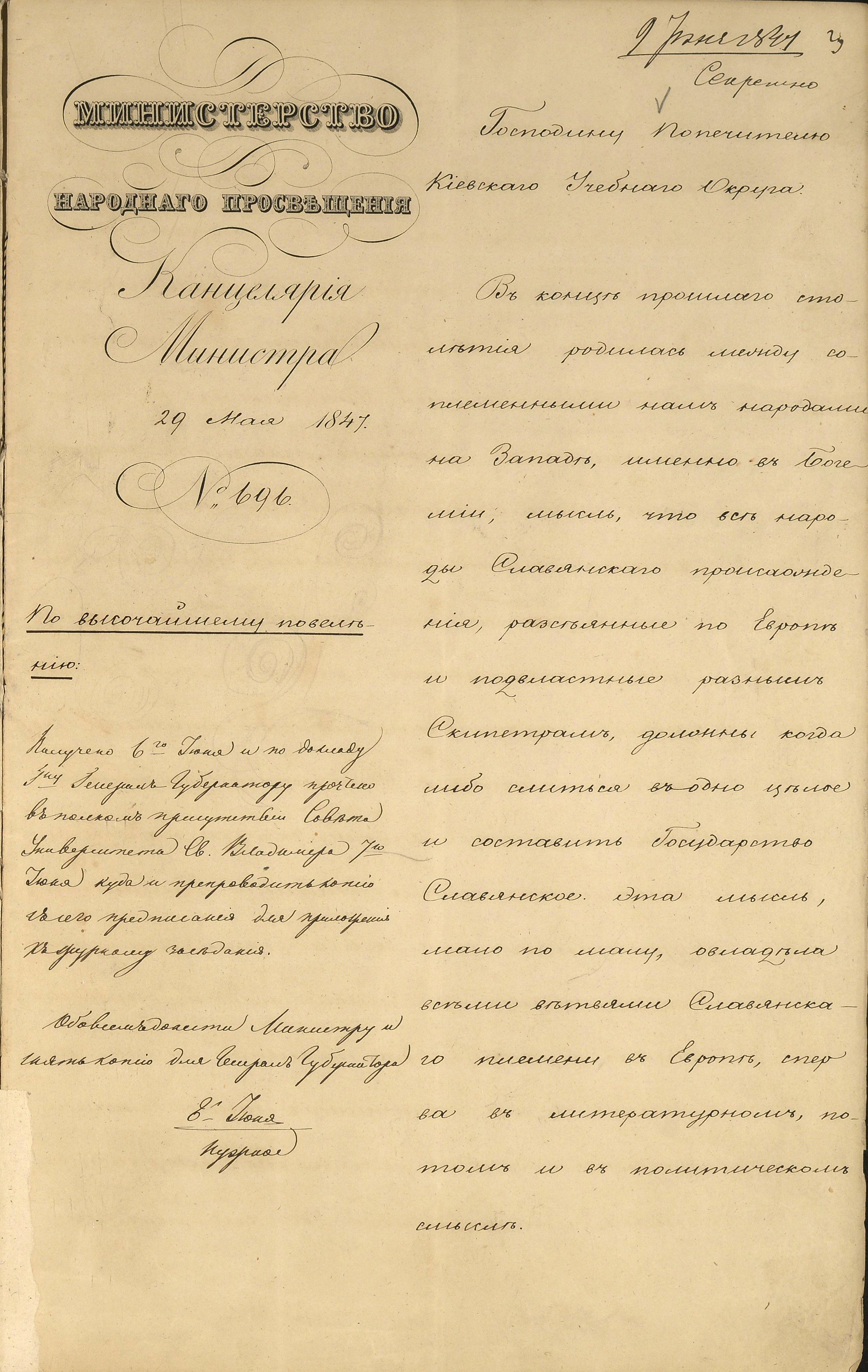 1876 р., червня 15. – Циркуляр Міністерства народної освіти помічникові попечителя Київського навчального округу І. П. Новікову