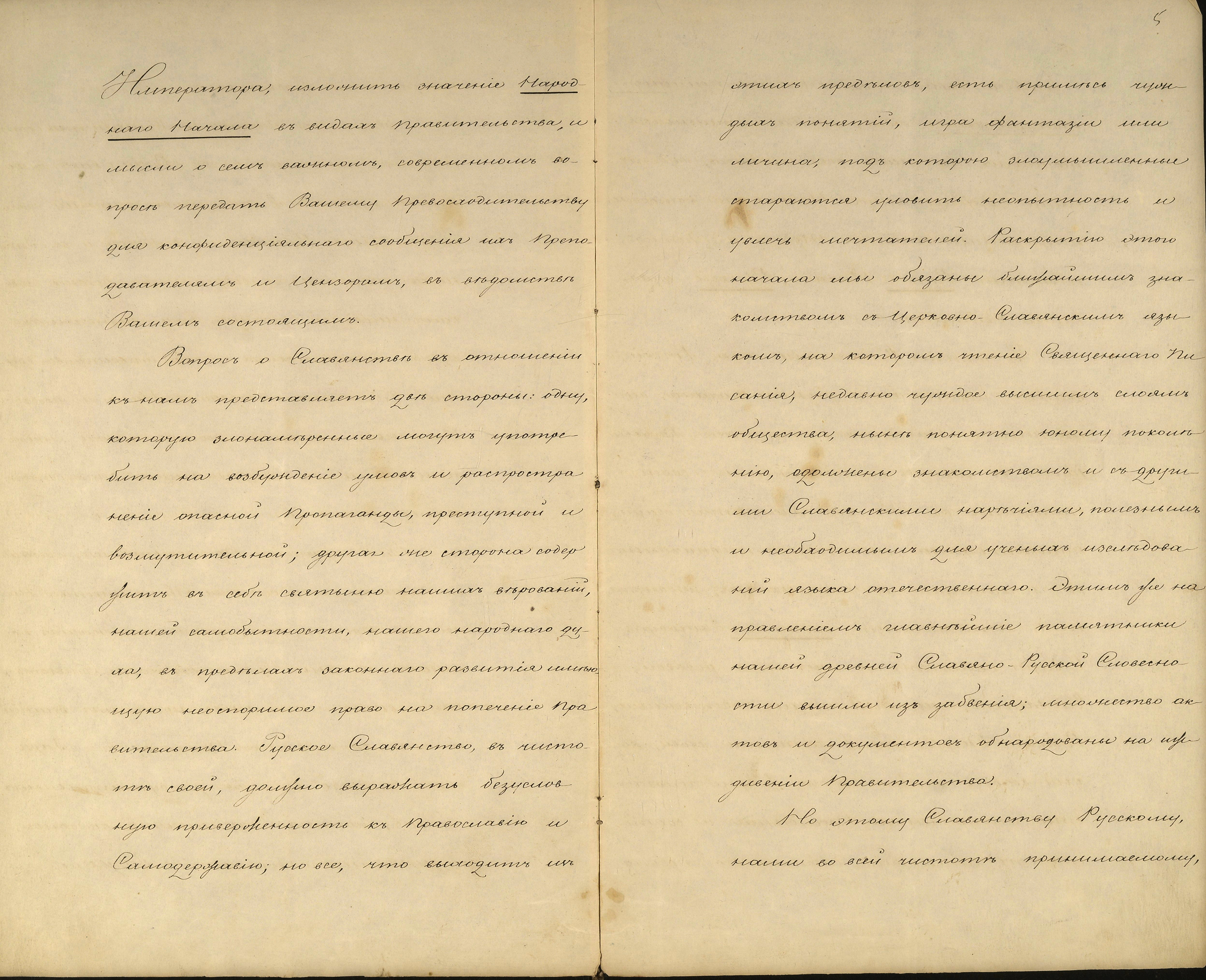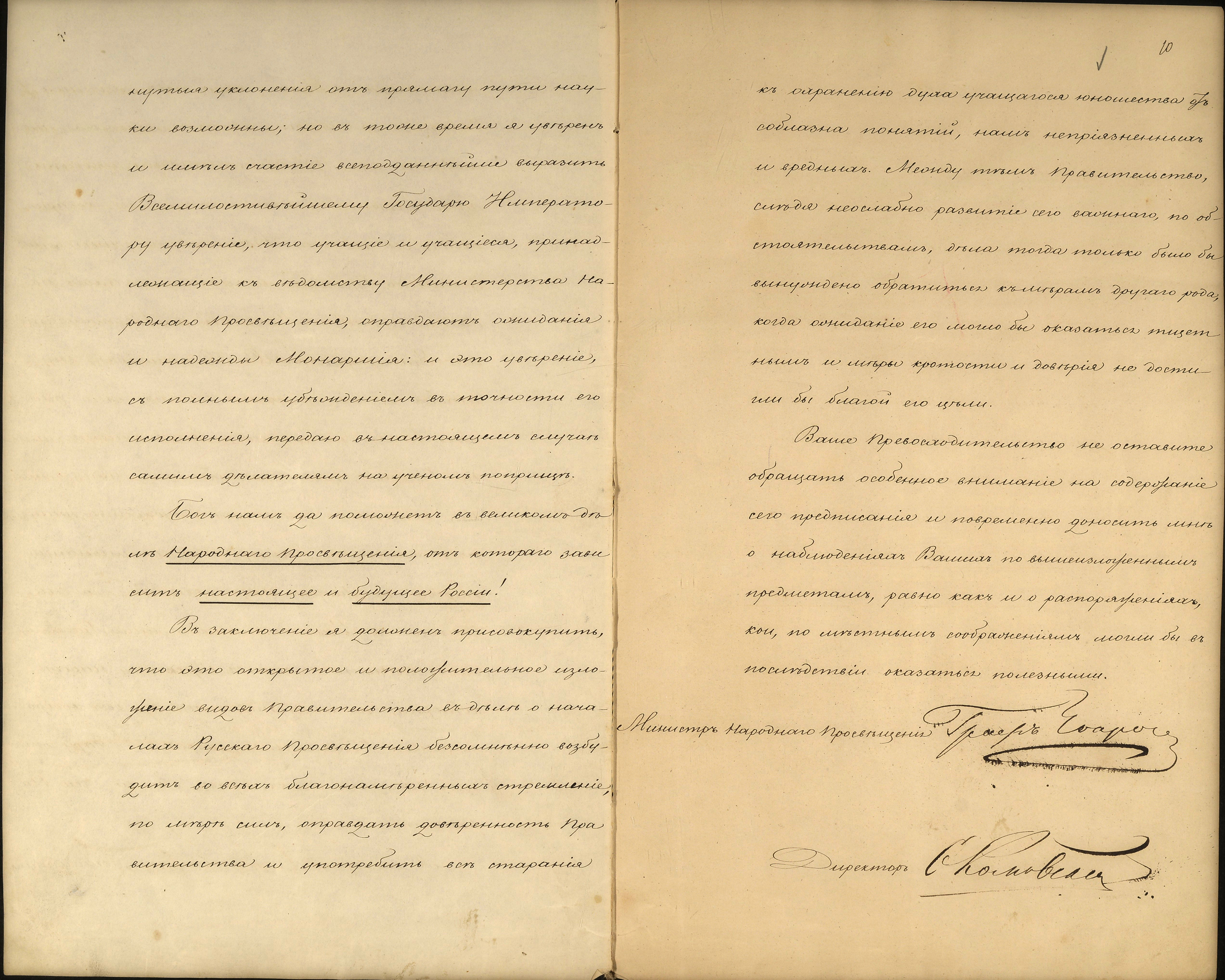 Першим документом на виставці є розпорядження міністра народної освіти Сергія Уварова 1847 р., що зобов’язувало викладачів Київського університету надавати перевагу російській мові, літературі, історії права. Цей документ з’явився як реакція на посилення інтересу до вивчення української мови, фольклору і літератури; формулювання політичних завдань українського руху в програмі Кирило-Мефодіївського братства; поширення творів Тараса Шевченка і Пантелеймона Куліша; пробудження інтересу до історії українського народу, викликаного публікацією «Історії Русів» у 1846 р.