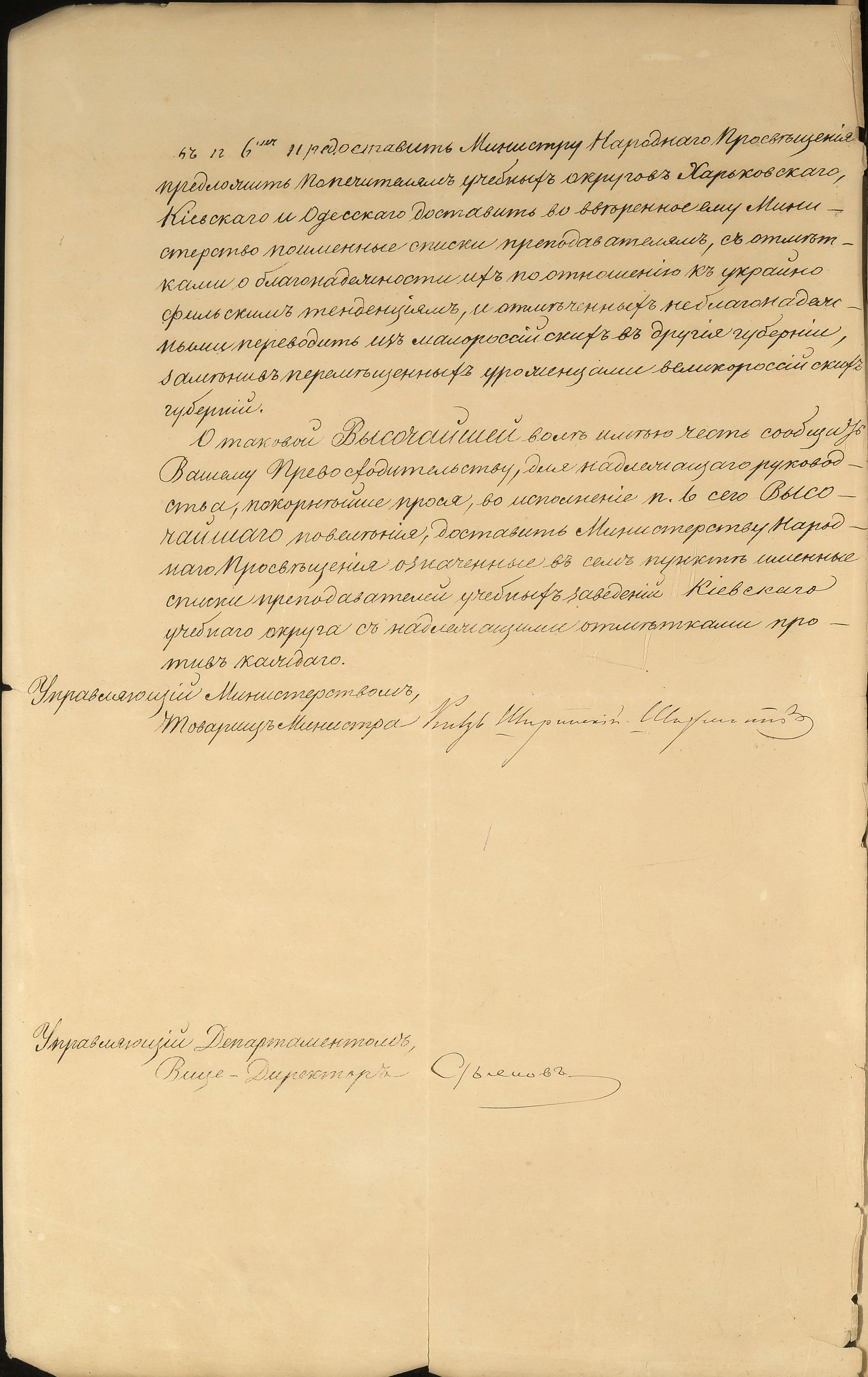 заміну неблагонадійних викладачів «вихідцями з великоросійських губерній»,