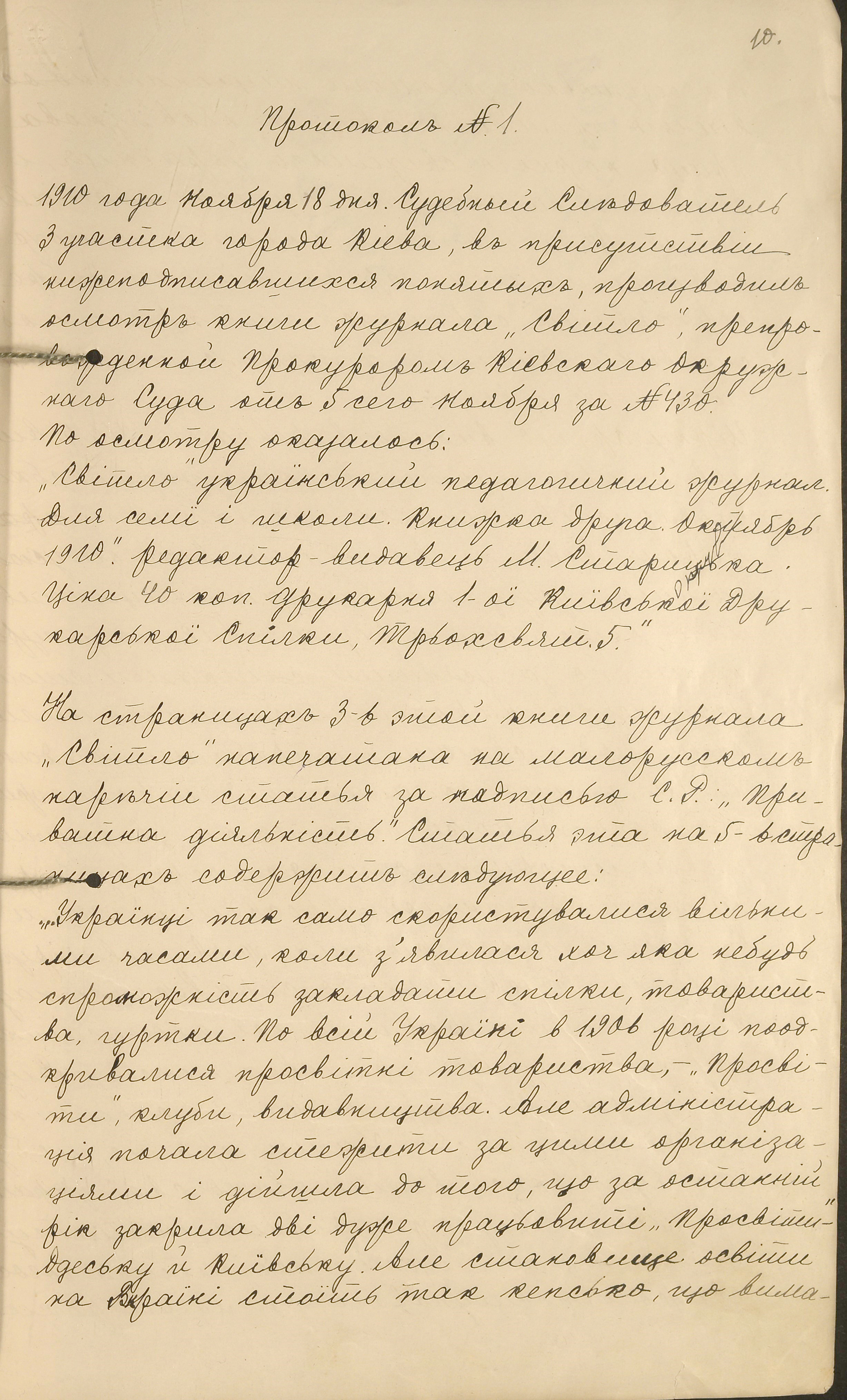 1910 р., листопада 18. – Огляд педагогічного журналу «Світло», складений судовим слідчим 3-ї дільниці м. Києва,