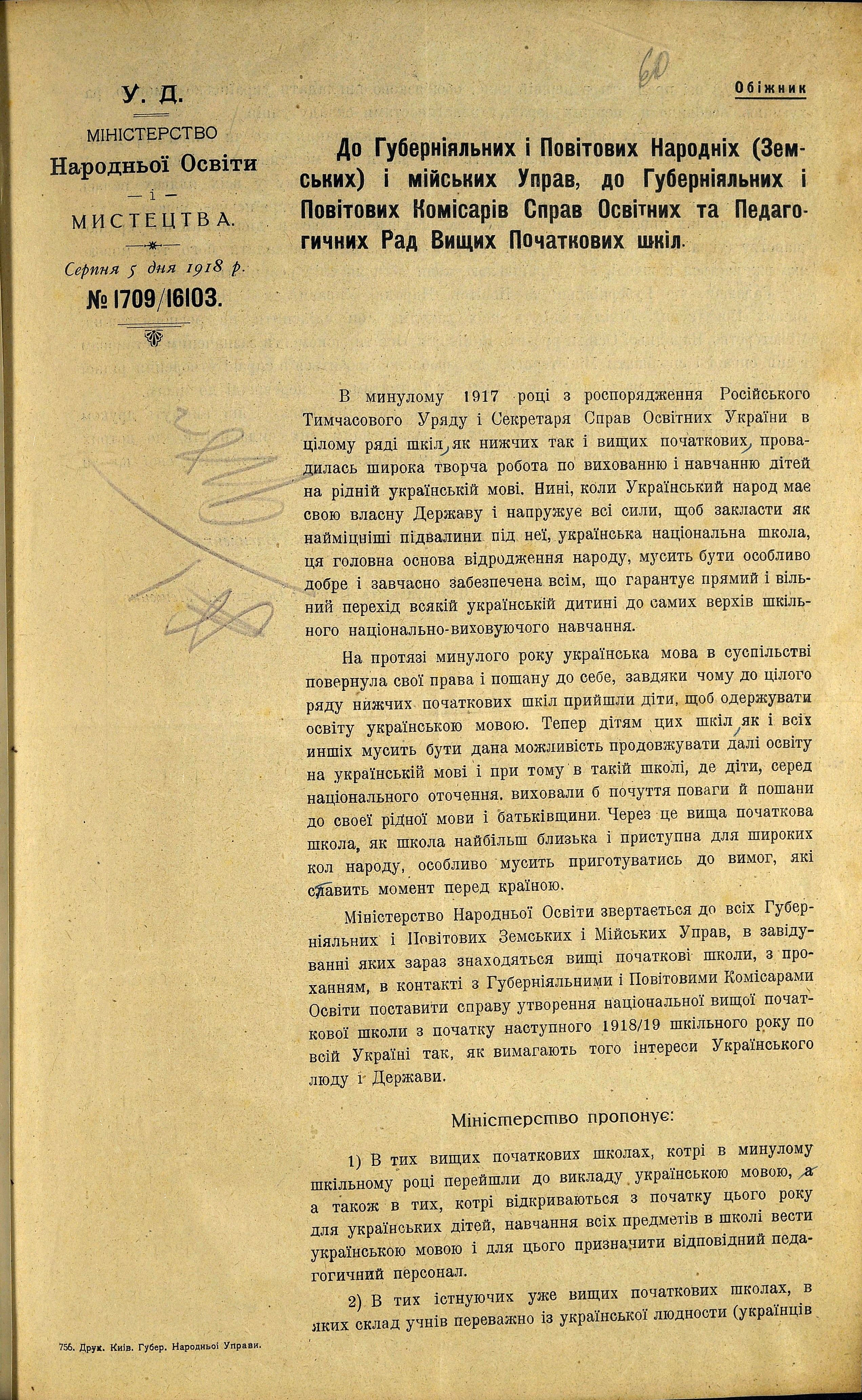 1918 р., серпня 05. – Обіжник Міністерства народної освіти і мистецтва Української держави «До губернських і повітових народних (земських) і міських управ,