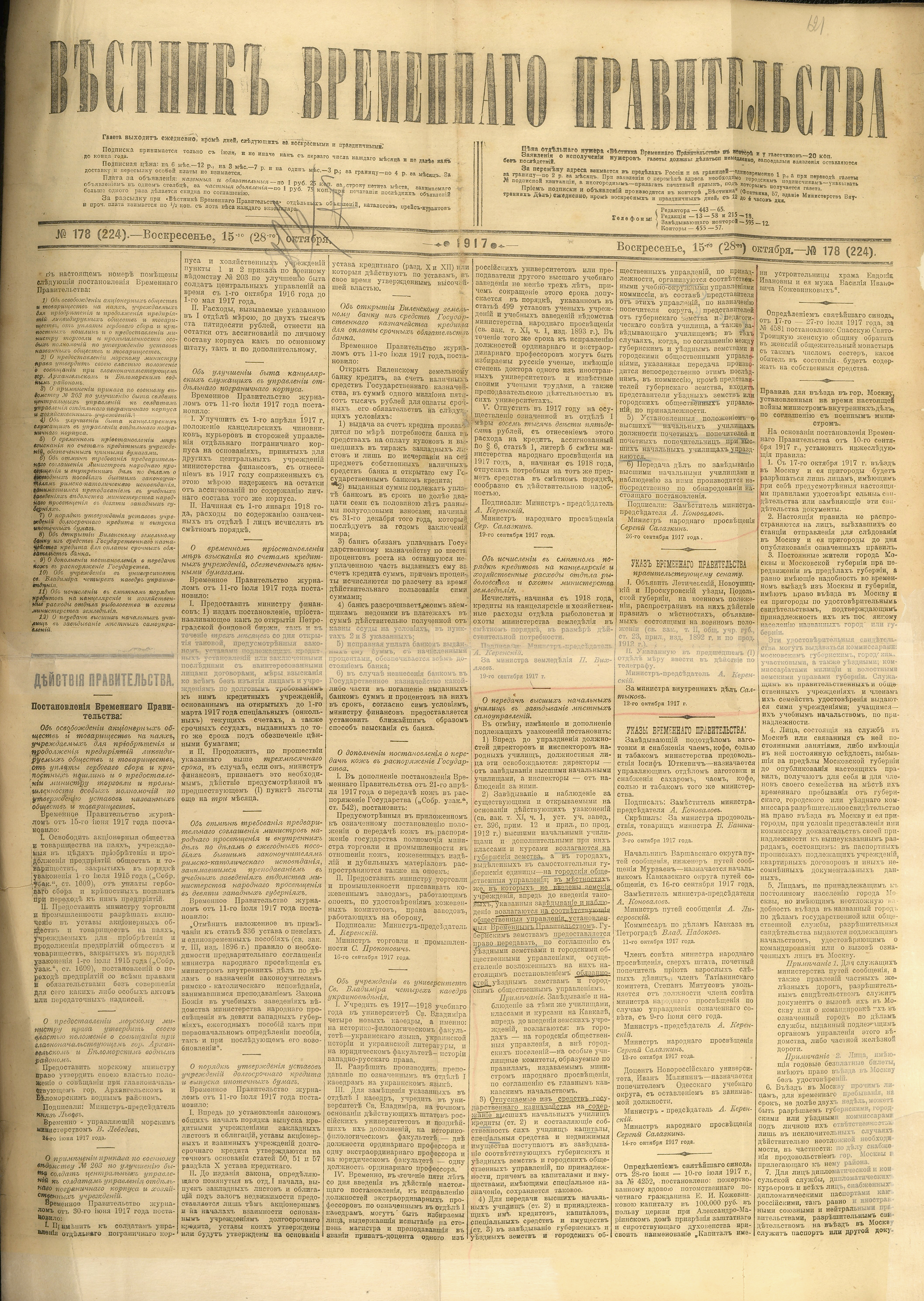 1917 р., жовтня 15 (28). – Газета «Вісник Тимчасового Уряду», де розміщено