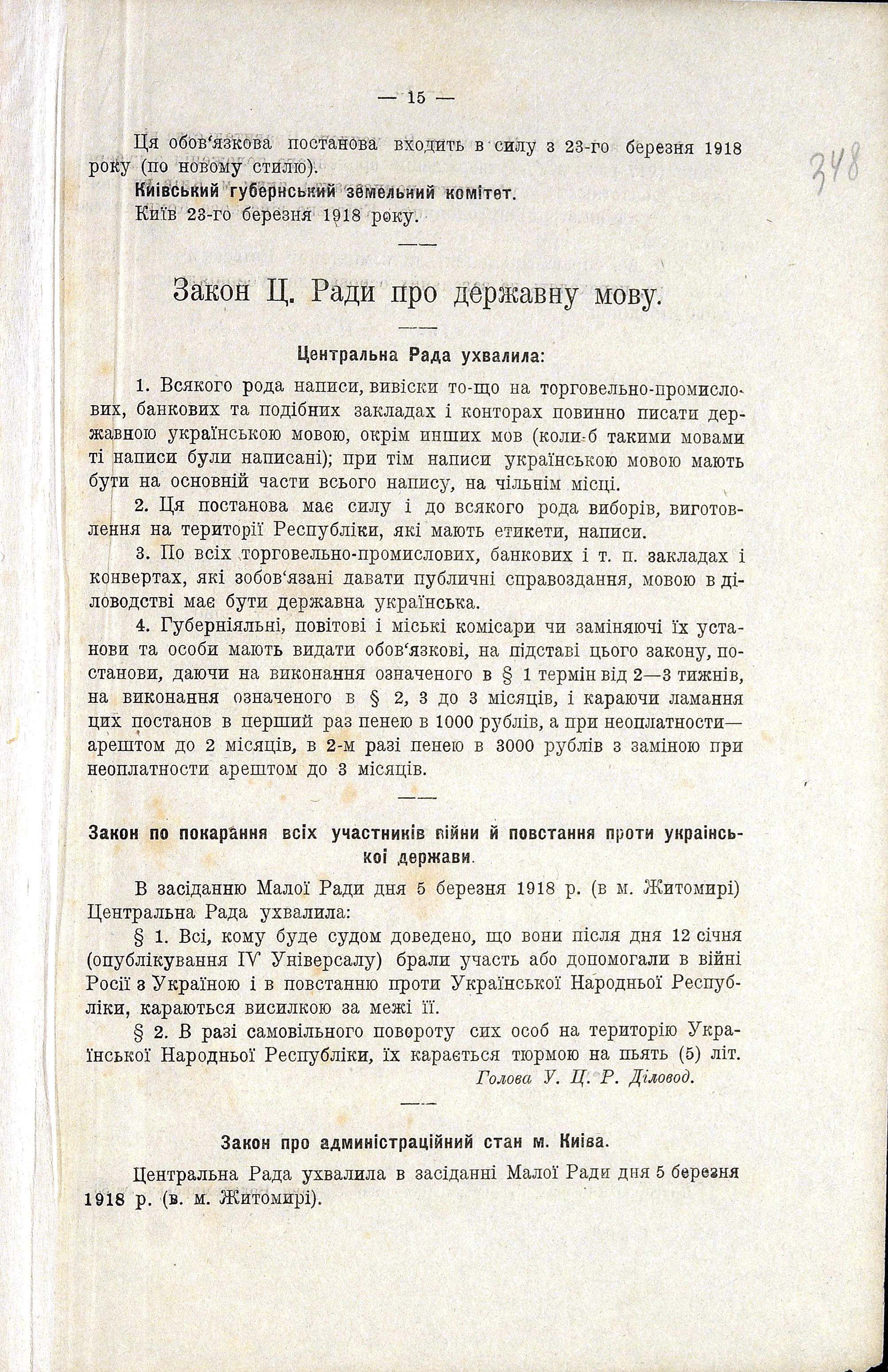 [1918 р., березень]. – Закон Центральної Ради Української Народної Республіки «Про державну мову».