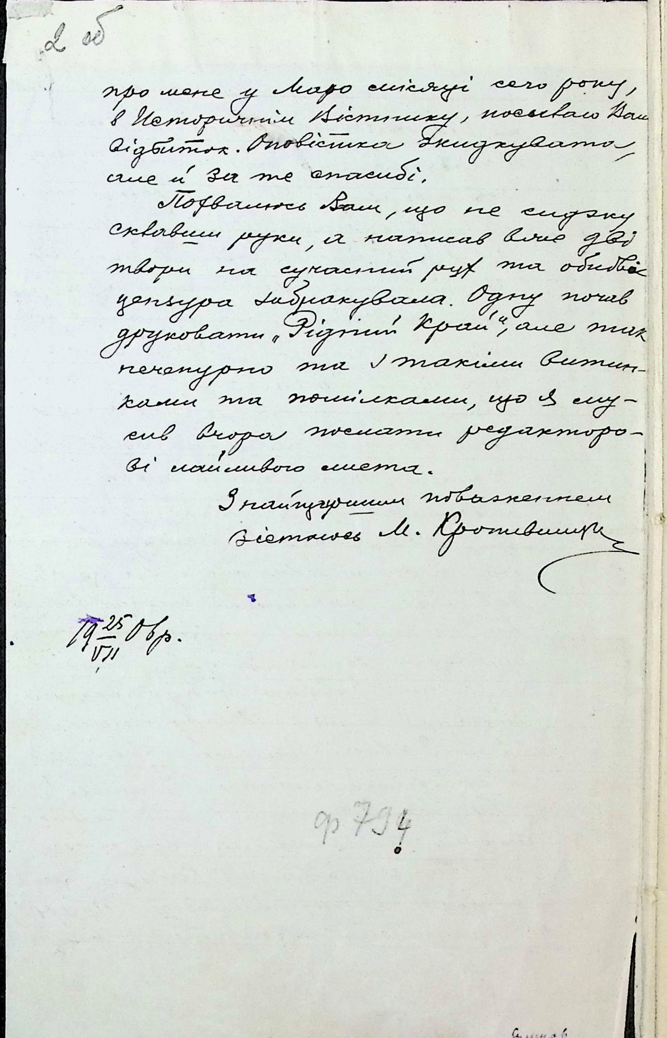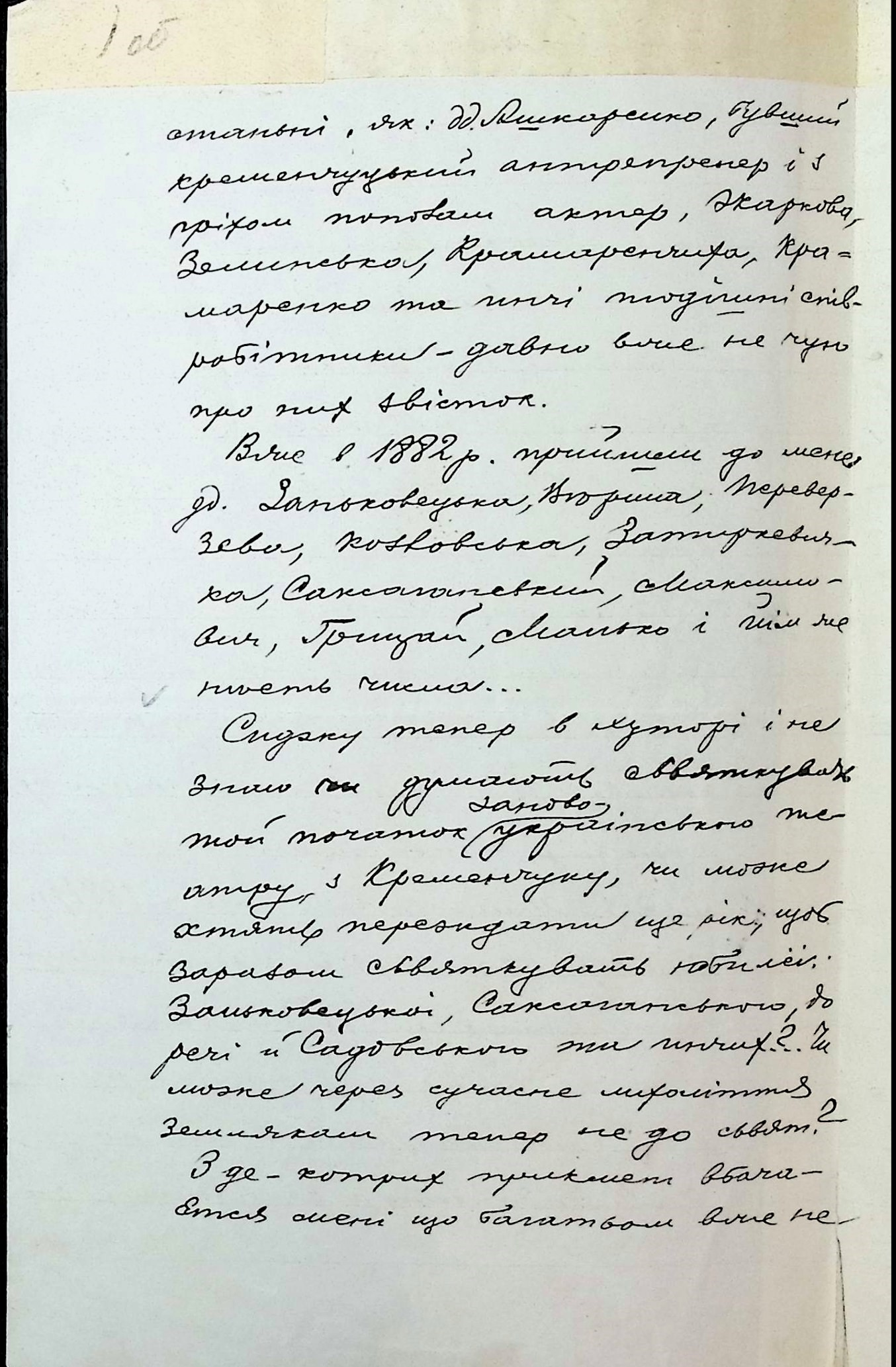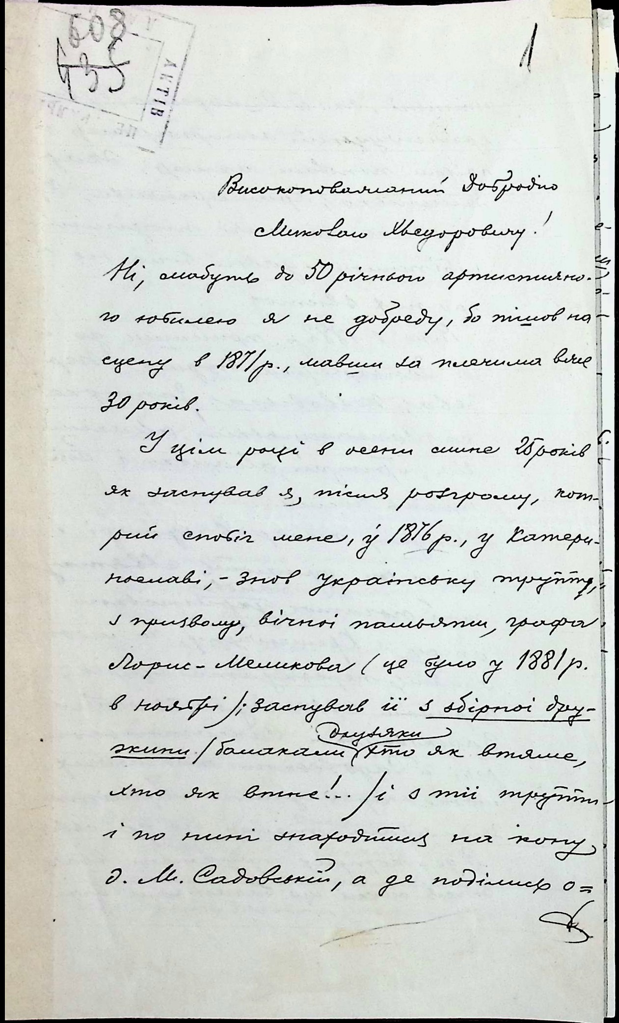 1906 р., липня 25. – Лист М. Л. Кропивницького до М. Ф. Сумцова про 25-річчя заснування
